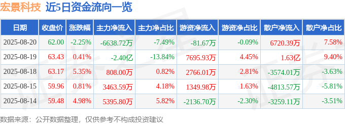截至2025年8月20日收盘,宏景科技(301396)报收于62.0元,下跌2.25%,换手率19.0%,成交量14.45万手,成交额8.86亿元。