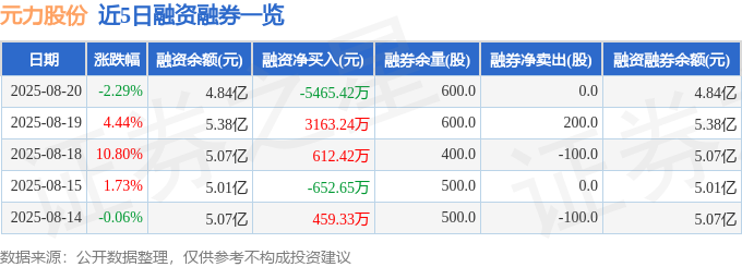 元力股份融资融券信息显示,融资方面,当日融资买入3059.46万元,融资偿还8524.89万元,融资净偿还5465.42万元。融券方面,融券卖出0.0股,融券偿还0.0股,融券余量600.0股,融券余额1.07万元。融资融券余额4.84亿元。