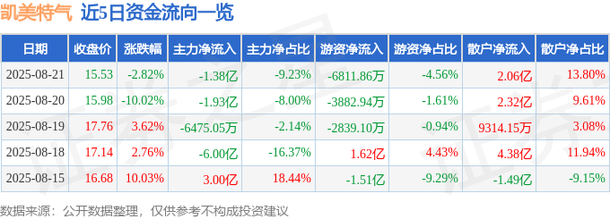 截至2025年8月21日收盘,凯美特气(002549)报收于15.53元,下跌2.82%,换手率13.72%,成交量94.99万手,成交额14.93亿元。
