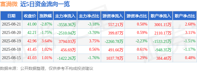截至2025年8月21日收盘,富满微(300671)报收于41.0元,下跌2.87%,换手率11.83%,成交量25.68万手,成交额11.19亿元。