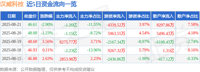 截至2025年8月21日收盘,汉威科技(300007)报收于46.61元,下跌2.9%,换手率8.12%,成交量22.98万手,成交额10.94亿元。