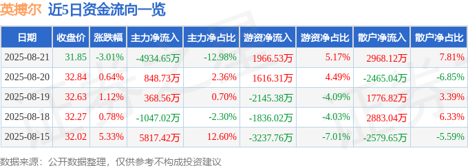 截至2025年8月21日收盘,英搏尔(300681)报收于31.85元,下跌3.01%,换手率6.42%,成交量11.81万手,成交额3.8亿元。