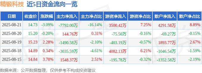 截至2025年8月21日收盘,精锻科技(300258)报收于14.73元,下跌3.09%,换手率5.7%,成交量32.51万手,成交额4.83亿元。