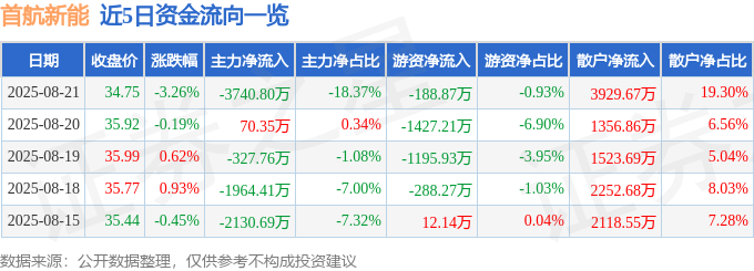 截至2025年8月21日收盘,首航新能(301658)报收于34.75元,下跌3.26%,换手率15.01%,成交量5.81万手,成交额2.04亿元。