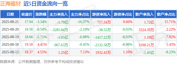 截至2025年8月21日收盘,正海磁材(300224)报收于17.94元,下跌3.34%,换手率7.24%,成交量60.24万手,成交额10.94亿元。