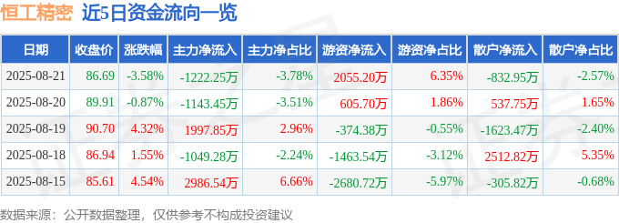 截至2025年8月21日收盘,恒工精密(301261)报收于86.69元,下跌3.58%,换手率9.77%,成交量3.66万手,成交额3.24亿元。