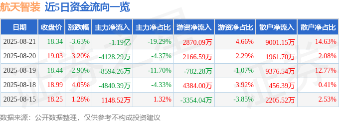 截至2025年8月21日收盘,航天智装(300455)报收于18.34元,下跌3.63%,换手率4.7%,成交量33.28万手,成交额6.15亿元。