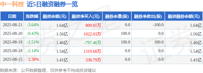 中一科技融资融券信息显示,融资方面,当日融资买入2569.7万元,融资偿还1760.69万元,融资净买入809.01万元。融券方面,融券卖出0.0股,融券偿还100.0股,融券余量0.0股,融券余额0.0万元。融资融券余额1.64亿元。
