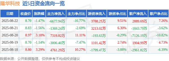 截至2025年8月22日收盘,隆华科技(300263)报收于8.7元,下跌1.47%,换手率4.81%,成交量45.52万手,成交额3.98亿元。