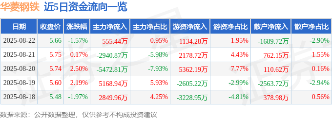 截至2025年8月22日收盘,华菱钢铁(000932)报收于5.66元,下跌1.57%,换手率1.5%,成交量103.39万手,成交额5.82亿元。