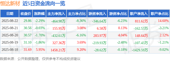 截至2025年8月22日收盘,恒达新材(301469)报收于29.86元,下跌2.29%,换手率4.03%,成交量1.85万手,成交额5560.85万元。