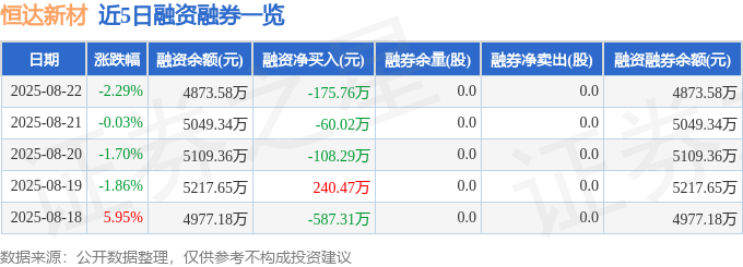 恒达新材融资融券信息显示,融资方面,当日融资买入733.95万元,融资偿还909.71万元,融资净偿还175.76万元。融券方面,融券卖出0.0股,融券偿还0.0股,融券余量0.0股,融券余额0.0万元。融资融券余额4873.58万元。