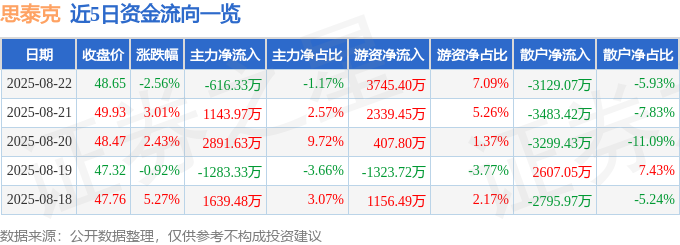 8月22日的资金流向数据方面,主力资金净流出616.33万元,占总成交额1.17%,游资资金净流入3745.4万元,占总成交额7.09%,散户资金净流出3129.07万元,占总成交额5.93%。