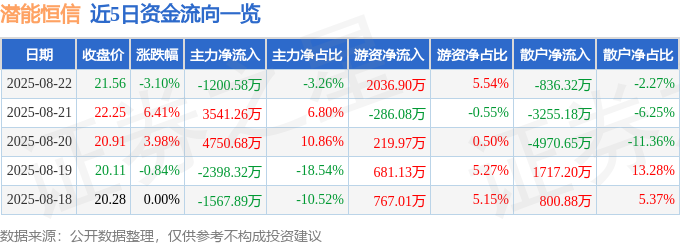 截至2025年8月22日收盘,潜能恒信(300191)报收于21.56元,下跌3.1%,换手率7.75%,成交量17.13万手,成交额3.68亿元。