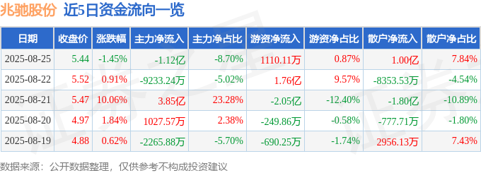 截至2025年8月25日收盘,兆驰股份(002429)报收于5.44元,下跌1.45%,换手率5.17%,成交量234.1万手,成交额12.82亿元。