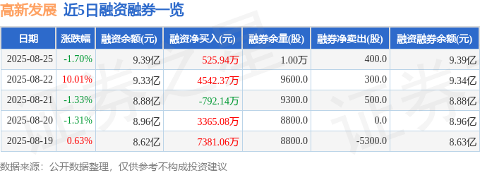 高新发展融资融券信息显示,融资方面,当日融资买入2.21亿元,融资偿还2.16亿元,融资净买入525.94万元。融券方面,融券卖出1000.0股,融券偿还600.0股,融券余量1.0万股,融券余额60.29万元。融资融券余额9.39亿元。