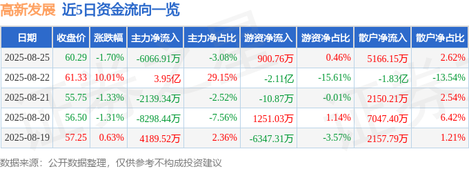 截至2025年8月25日收盘,高新发展(000628)报收于60.29元,下跌1.7%,换手率16.64%,成交量31.99万手,成交额19.68亿元。