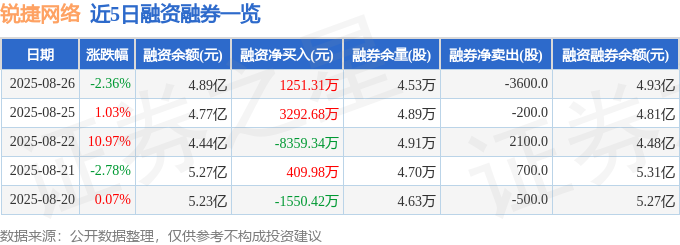 锐捷网络融资融券信息显示,融资方面,当日融资买入1.65亿元,融资偿还1.53亿元,融资净买入1251.31万元。融券方面,融券卖出1500.0股,融券偿还5100.0股,融券余量4.53万股,融券余额403.03万元。融资融券余额4.93亿元。