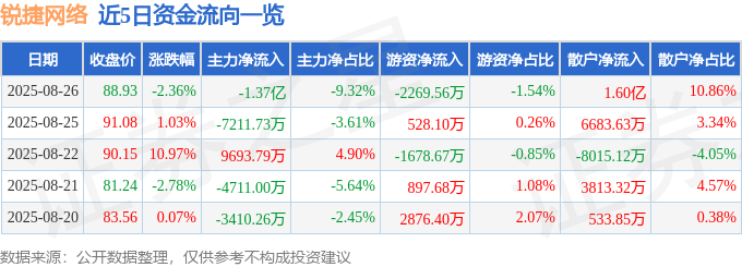截至2025年8月26日收盘,锐捷网络(301165)报收于88.93元,下跌2.36%,换手率17.1%,成交量16.32万手,成交额14.74亿元。