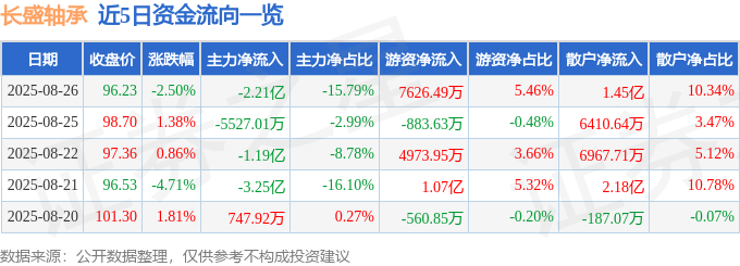 截至2025年8月26日收盘,长盛轴承(300718)报收于96.23元,下跌2.5%,换手率7.43%,成交量14.41万手,成交额13.98亿元。