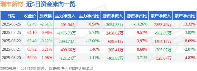 截至2025年8月26日收盘,瑞丰新材(300910)报收于62.49元,下跌2.51%,换手率1.65%,成交量3.43万手,成交额2.14亿元。