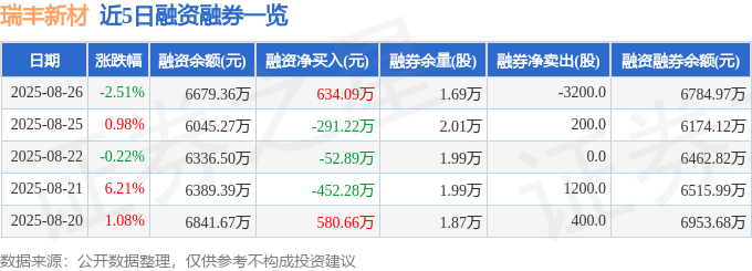 瑞丰新材融资融券信息显示,融资方面,当日融资买入1620.5万元,融资偿还986.41万元,融资净买入634.09万元。融券方面,融券卖出300.0股,融券偿还3500.0股,融券余量1.69万股,融券余额105.61万元。融资融券余额6784.97万元。