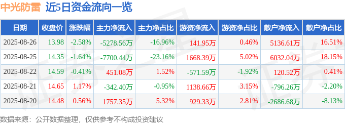 截至2025年8月26日收盘,中光防雷(300414)报收于13.98元,下跌2.58%,换手率7.07%,成交量22.18万手,成交额3.11亿元。