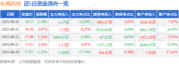 截至2025年8月26日收盘,长亮科技(300348)报收于18.11元,下跌2.58%,换手率9.55%,成交量67.67万手,成交额12.35亿元。
