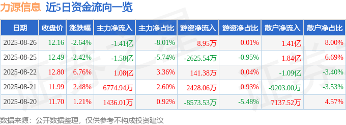 截至2025年8月26日收盘,力源信息(300184)报收于12.16元,下跌2.64%,换手率13.66%,成交量143.28万手,成交额17.56亿元。