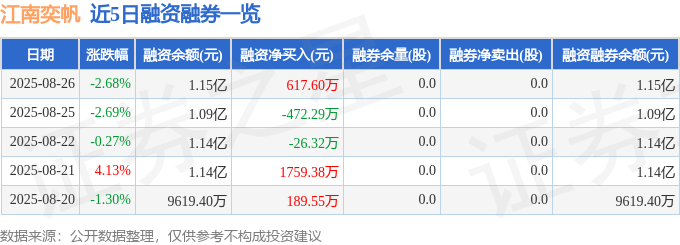 江南奕帆融资融券信息显示,融资方面,当日融资买入2507.04万元,融资偿还1889.44万元,融资净买入617.6万元。融券方面,融券卖出0.0股,融券偿还0.0股,融券余量0.0股,融券余额0.0万元。融资融券余额1.15亿元。