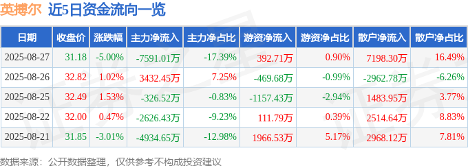 截至2025年8月27日收盘,英搏尔(300681)报收于31.18元,下跌5.0%,换手率7.38%,成交量13.57万手,成交额4.36亿元。