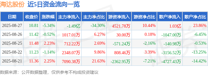 截至2025年8月27日收盘,海达股份(300320)报收于10.81元,下跌5.34%,换手率7.98%,成交量38.75万手,成交额4.33亿元。