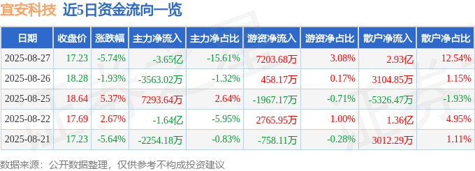 截至2025年8月27日收盘,宜安科技(300328)报收于17.23元,下跌5.74%,换手率18.91%,成交量129.81万手,成交额23.4亿元。