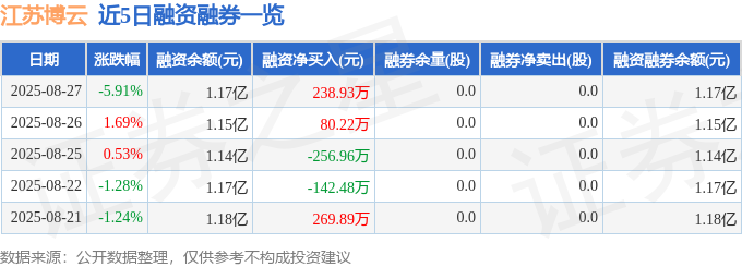 江苏博云融资融券信息显示,融资方面,当日融资买入1872.83万元,融资偿还1633.9万元,融资净买入238.93万元。融券方面,融券卖出0.0股,融券偿还0.0股,融券余量0.0股,融券余额0.0万元。融资融券余额1.17亿元。