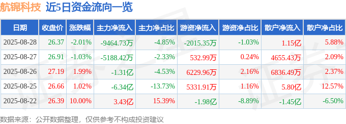 截至2025年8月28日收盘,航锦科技(000818)报收于26.37元,下跌2.01%,换手率11.29%,成交量74.34万手,成交额19.51亿元。