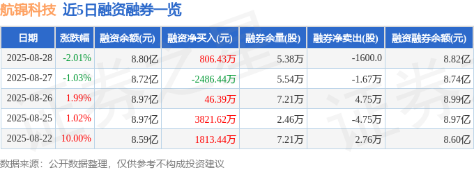 航锦科技融资融券信息显示,融资方面,当日融资买入1.58亿元,融资偿还1.5亿元,融资净买入806.43万元。融券方面,融券卖出0.0股,融券偿还1600.0股,融券余量5.38万股,融券余额141.87万元。融资融券余额8.82亿元。