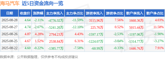 截至2025年8月28日收盘,海马汽车(000572)报收于4.64元,下跌2.11%,换手率5.39%,成交量88.58万手,成交额4.12亿元。
