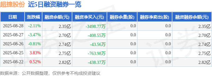 超捷股份融资融券信息显示,融资方面,当日融资买入3986.59万元,融资偿还7485.36万元,融资净偿还3498.77万元。融券方面,融券卖出0.0股,融券偿还0.0股,融券余量0.0股,融券余额0.0万元。融资融券余额2.35亿元。