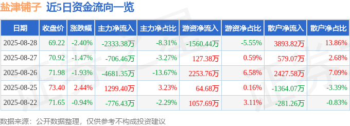 截至2025年8月28日收盘,盐津铺子(002847)报收于69.22元,下跌2.4%,换手率1.65%,成交量4.05万手,成交额2.81亿元。
