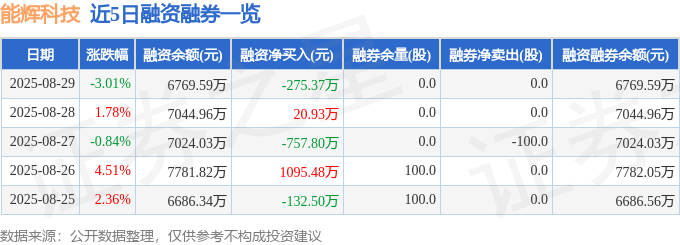 能辉科技融资融券信息显示,融资方面,当日融资买入559.54万元,融资偿还834.9万元,融资净偿还275.37万元。融券方面,融券卖出0.0股,融券偿还0.0股,融券余量0.0股,融券余额0.0万元。融资融券余额6769.59万元。
