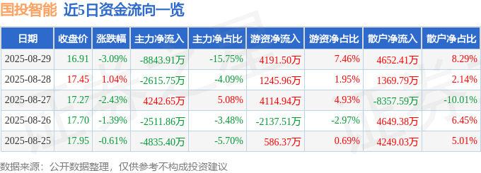 截至2025年8月29日收盘,国投智能(300188)报收于16.91元,下跌3.09%,换手率3.85%,成交量32.97万手,成交额5.61亿元。
