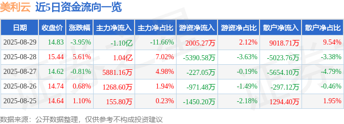 截至2025年8月29日收盘,美利云(000815)报收于14.83元,下跌3.95%,换手率9.12%,成交量63.43万手,成交额9.46亿元。