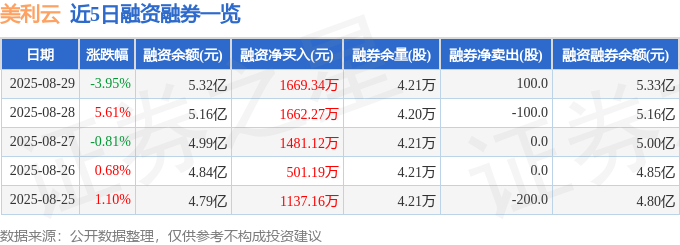 美利云融资融券信息显示,融资方面,当日融资买入8843.71万元,融资偿还7174.37万元,融资净买入1669.34万元,连续3日净买入累计4812.73万元。融券方面,融券卖出100.0股,融券偿还0.0股,融券余量4.21万股,融券余额62.43万元。融资融券余额5.33亿元。