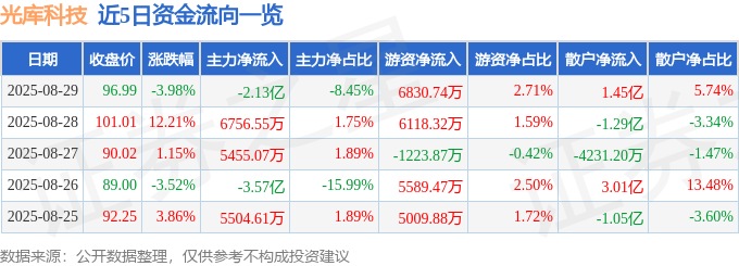 截至2025年8月29日收盘,光库科技(300620)报收于96.99元,下跌3.98%,换手率10.54%,成交量26.03万手,成交额25.23亿元。
