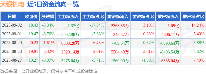 截至2025年9月2日收盘,天银机电(300342)报收于18.43元,下跌5.34%,换手率9.84%,成交量41.2万手,成交额7.63亿元。