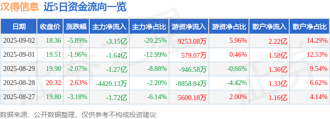 截至2025年9月2日收盘,汉得信息(300170)报收于18.36元,下跌5.89%,换手率8.58%,成交量83.57万手,成交额15.53亿元。