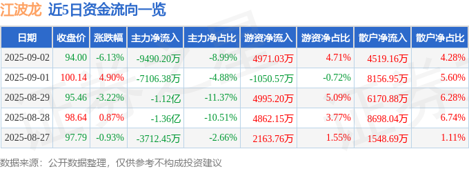 9月2日的资金流向数据方面,主力资金净流出9490.2万元,占总成交额8.99%,游资资金净流入4971.03万元,占总成交额4.71%,散户资金净流入4519.16万元,占总成交额4.28%。