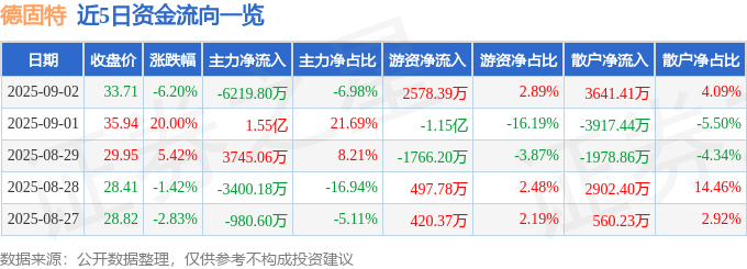 截至2025年9月2日收盘,德固特(300950)报收于33.71元,下跌6.2%,换手率27.73%,成交量25.06万手,成交额8.91亿元。