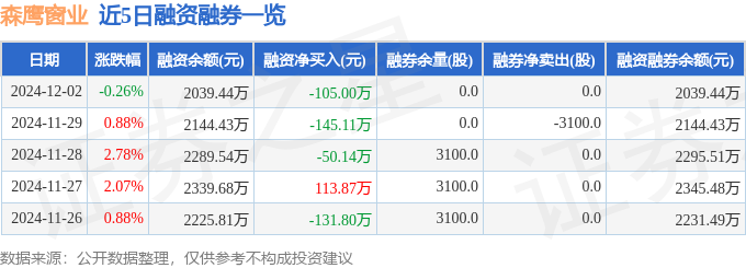 森鹰窗业融资融券信息显示,融资方面,当日融资买入356.9万元,融资偿还461.9万元,融资净偿还105.0万元。融券方面,融券卖出0.0股,融券偿还0.0股,融券余量0.0股,融券余额0.0万元。融资融券余额2039.44万元。