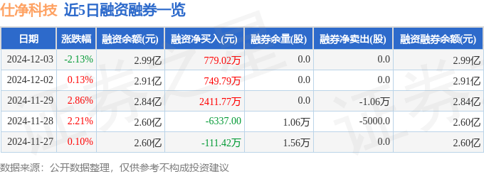 仕净科技融资融券信息显示,融资方面,当日融资买入2248.17万元,融资偿还1469.15万元,融资净买入779.02万元,连续3日净买入累计3940.58万元。融券方面,融券卖出0.0股,融券偿还0.0股,融券余量0.0股,融券余额0.0万元。融资融券余额2.99亿元。